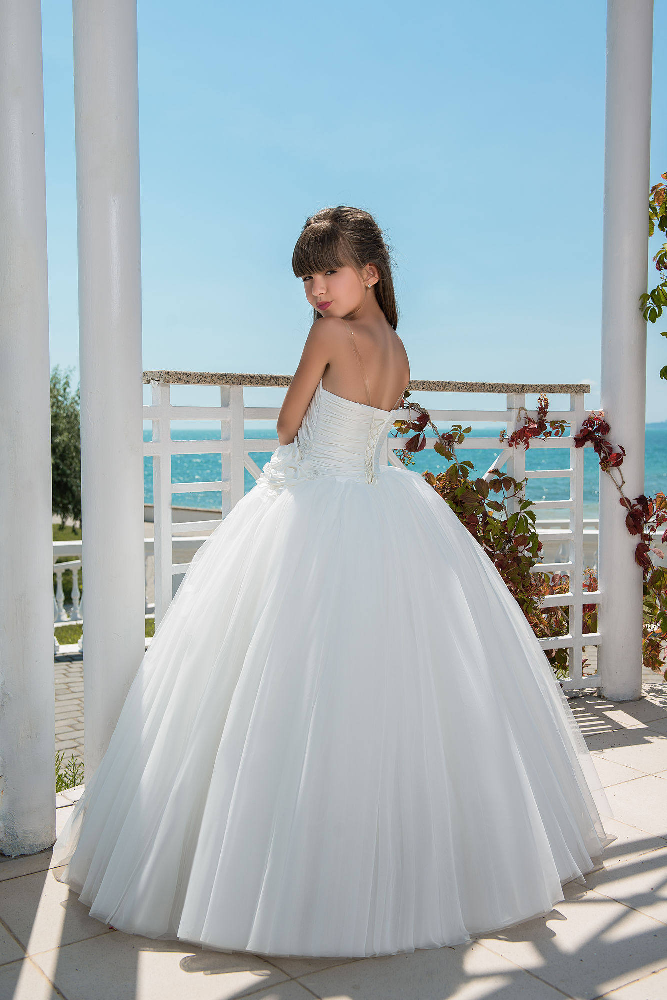 Пышный бальный наряд для юной модницы в цвете белом или айвори. Открытый верх и объемная юбка удачно сочетаются на изящной фигурке.