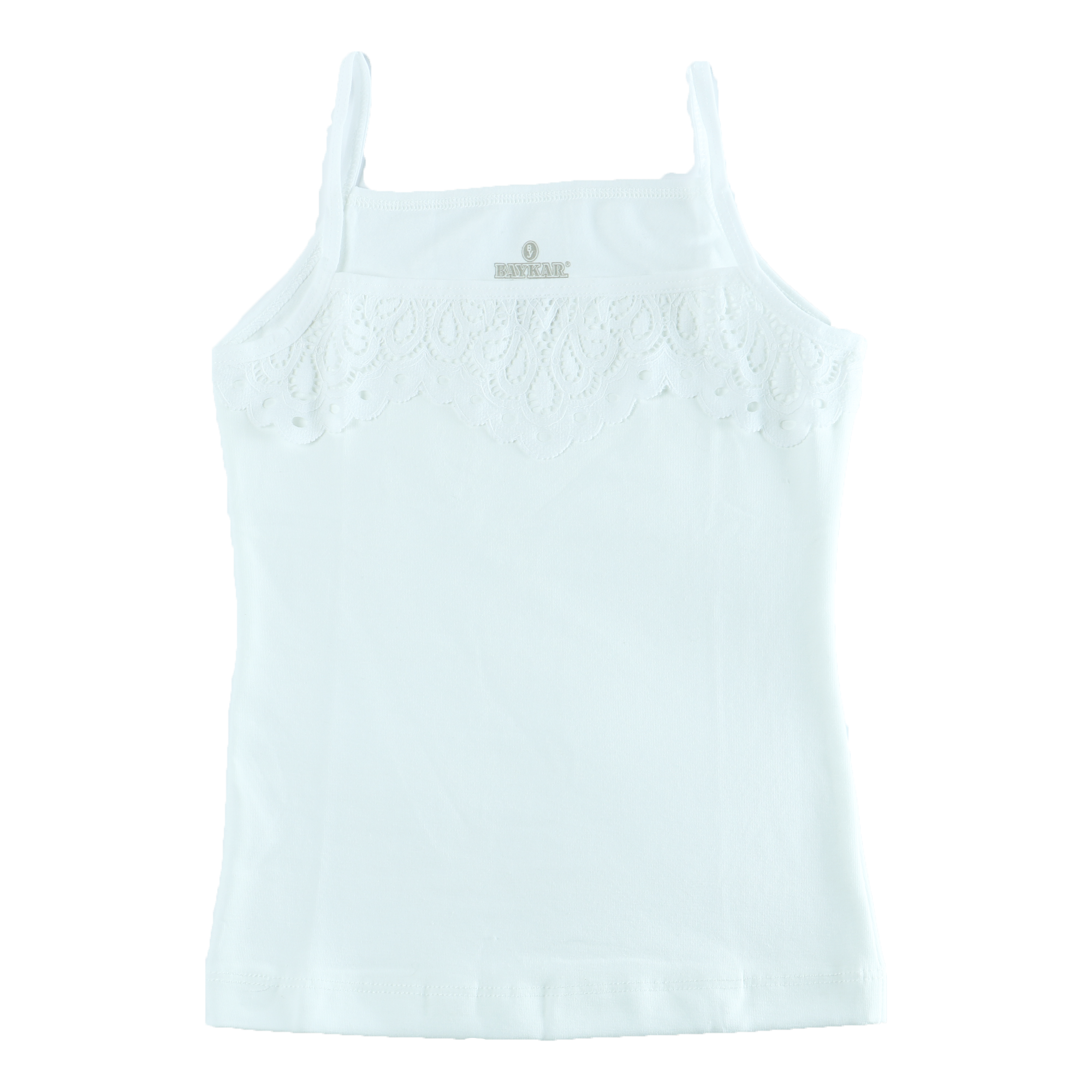 Модель: майка на тонкій бретелі Склад: бавовна 95%, еластан 5% Декор: мереживо Фурнітура: бретель Виробник: ТМ “Baykar”, Туреччина